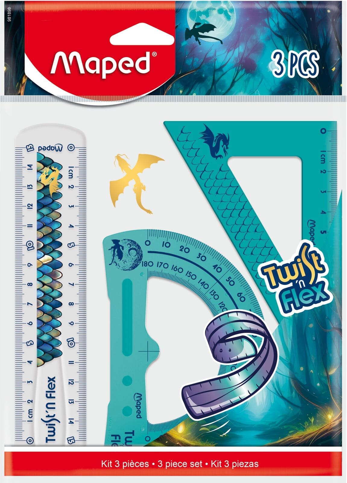Mini kit de traçage Twist’n Flex Dragon, 3 pièces (règle 15 cm, équerre, raporteur)