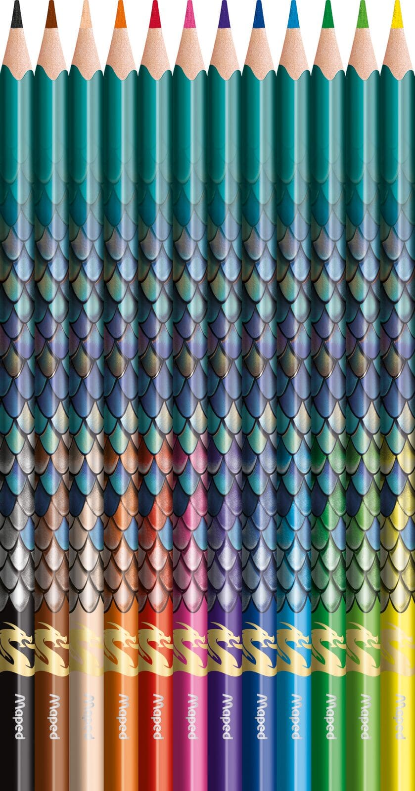 Pochette de 12 crayons de couleur Dragon, aux couleurs vives et au décor féérique, pour dessiner et colorier à l’école.