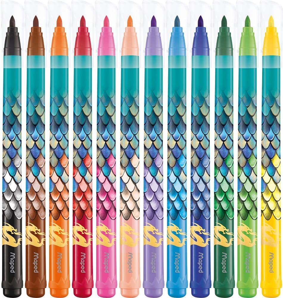 Feutres de coloriage Dragon aux couleurs vives, avec pointes résistantes et encre lavable pour dessiner et colorier.