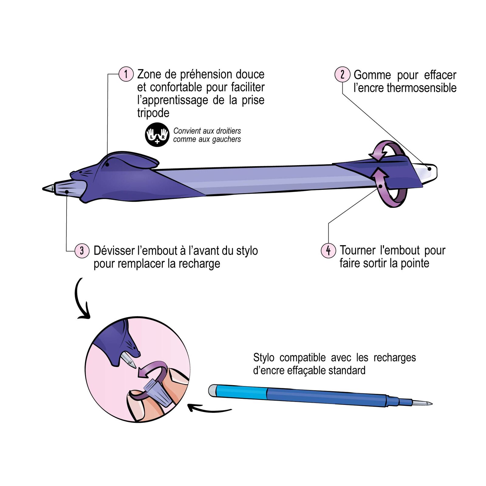 Rechargeable en un geste grâce à son embout dévissable à l’avant du stylo, le stylo Kidy Learn Magic accompagne les enfants sur la durée, tout au long de leur apprentissage. Son système rotatif sans capuchon évite les pertes dans la trousse, un vrai plus pour l’école comme pour la maison.