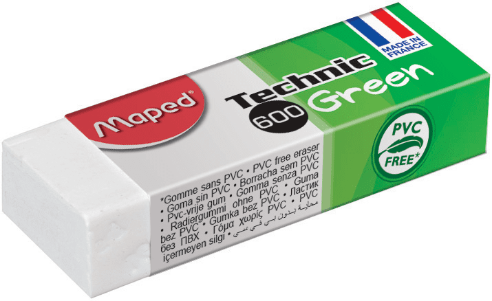 Conçue et fabriquée en France, la gomme Technic 600 Green est sans phtalates ni PVC. Grâce à sa technologie « Dust Free », la gomme Technic 600 laisse très peu de résidus : elle garde les feuilles propres et nettes après chaque correction.