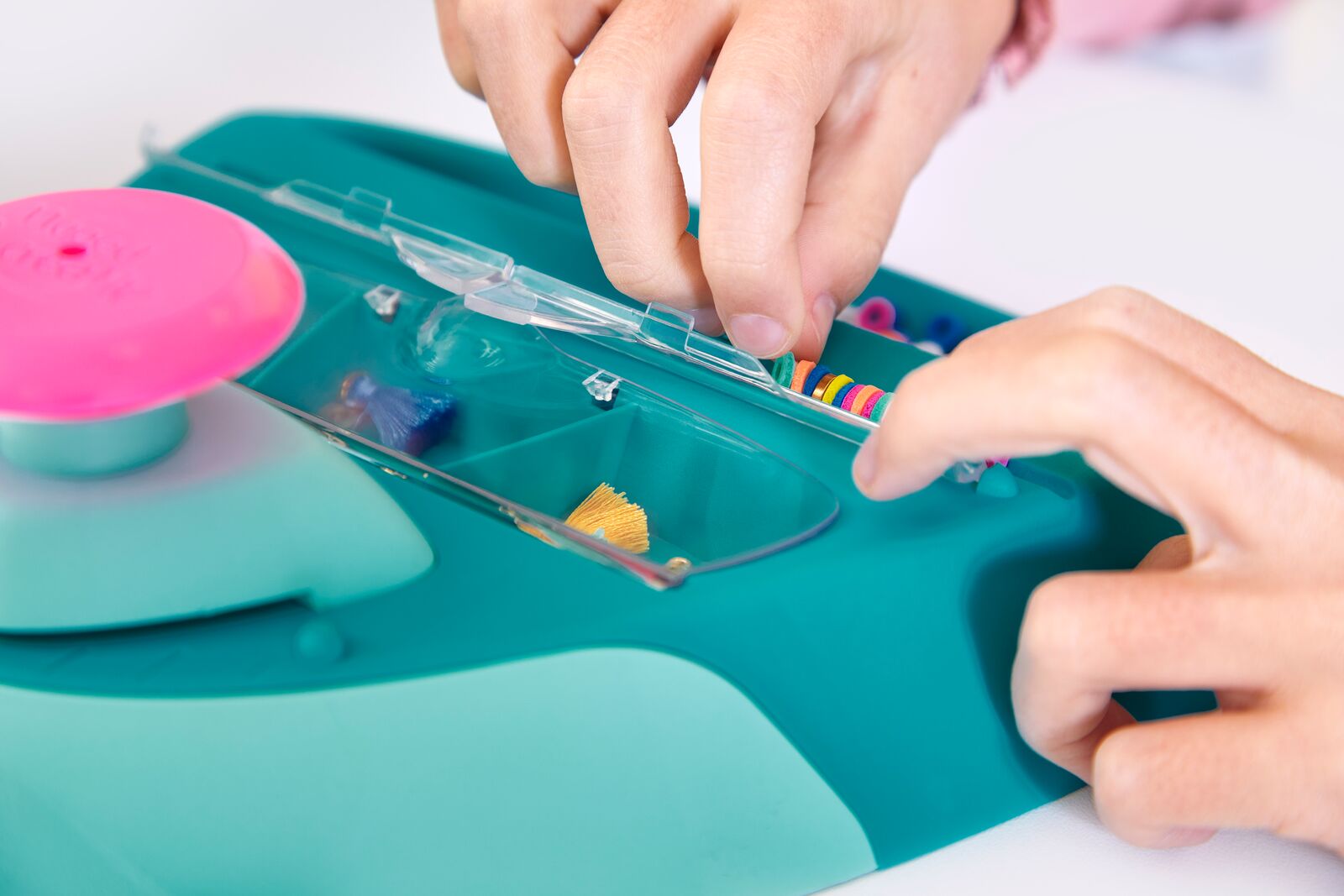 Très simple d’utilisation, les différents espaces de la machine accompagnent les enfants dans toutes les étapes de création de leurs bracelets. Une zone de rangement avec un couvercle permet de ranger les perles et accessoires.