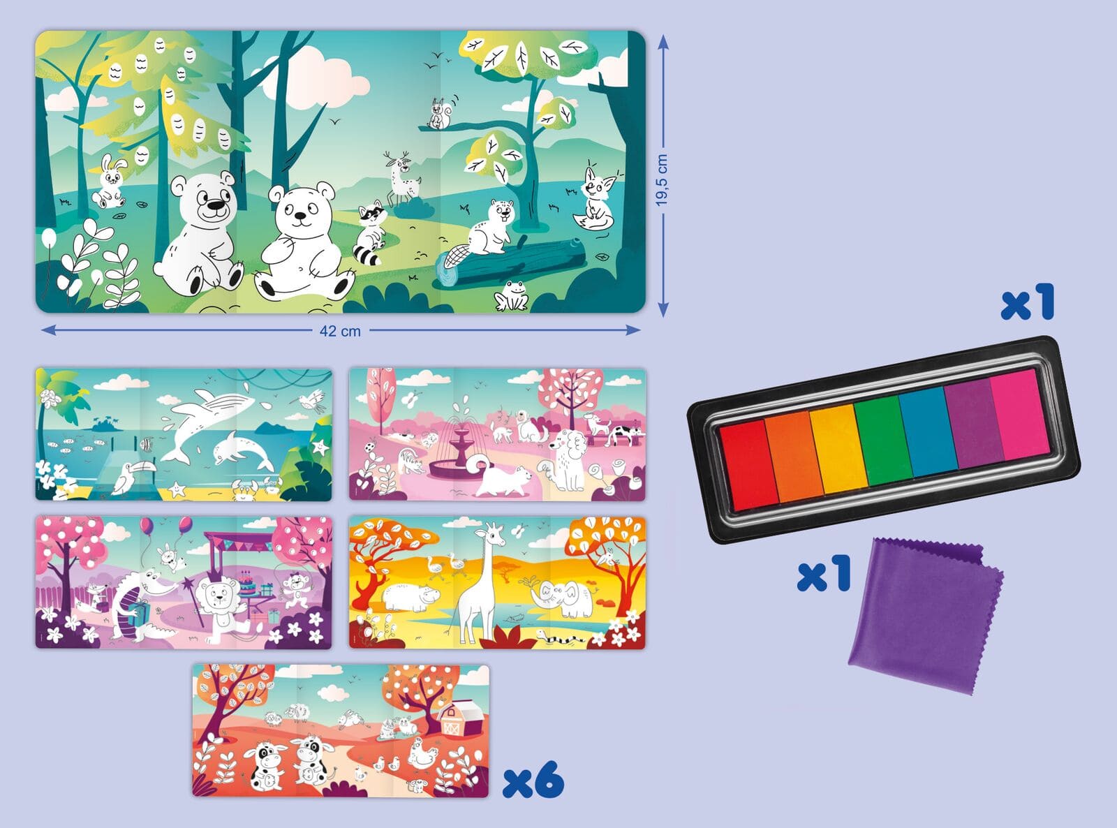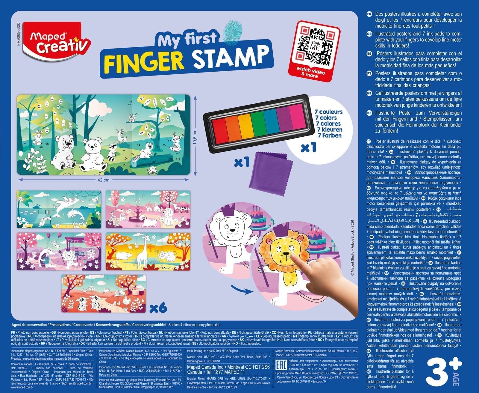 Le kit créatif My First Finger Stamp est composé de : 6 posters illustrés (42 x 19,5 cm), 1 encreur 7 couleurs (rouge, orange, jaune, vert, bleu, violet, rose), 1 chiffonnette.
