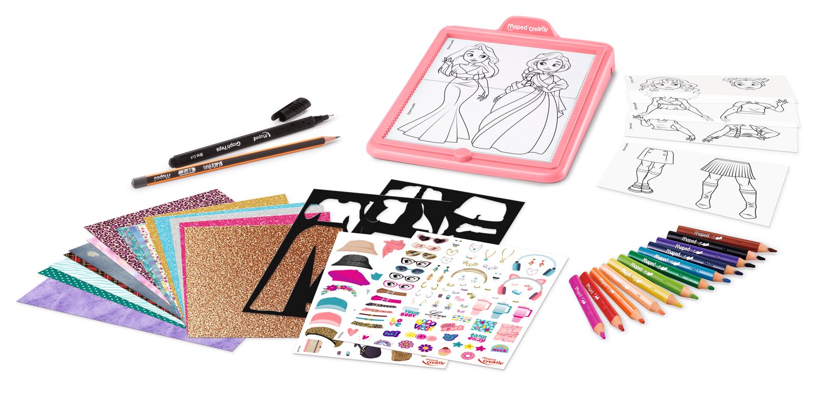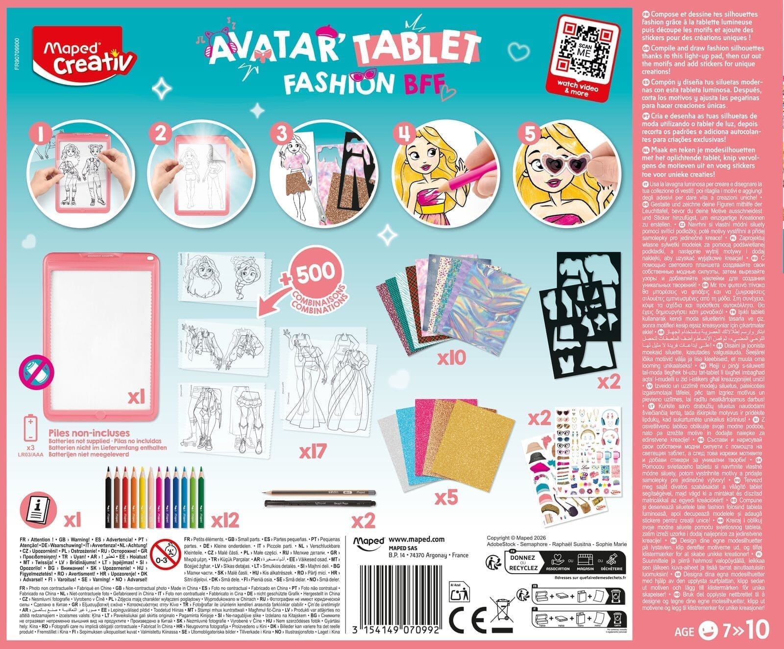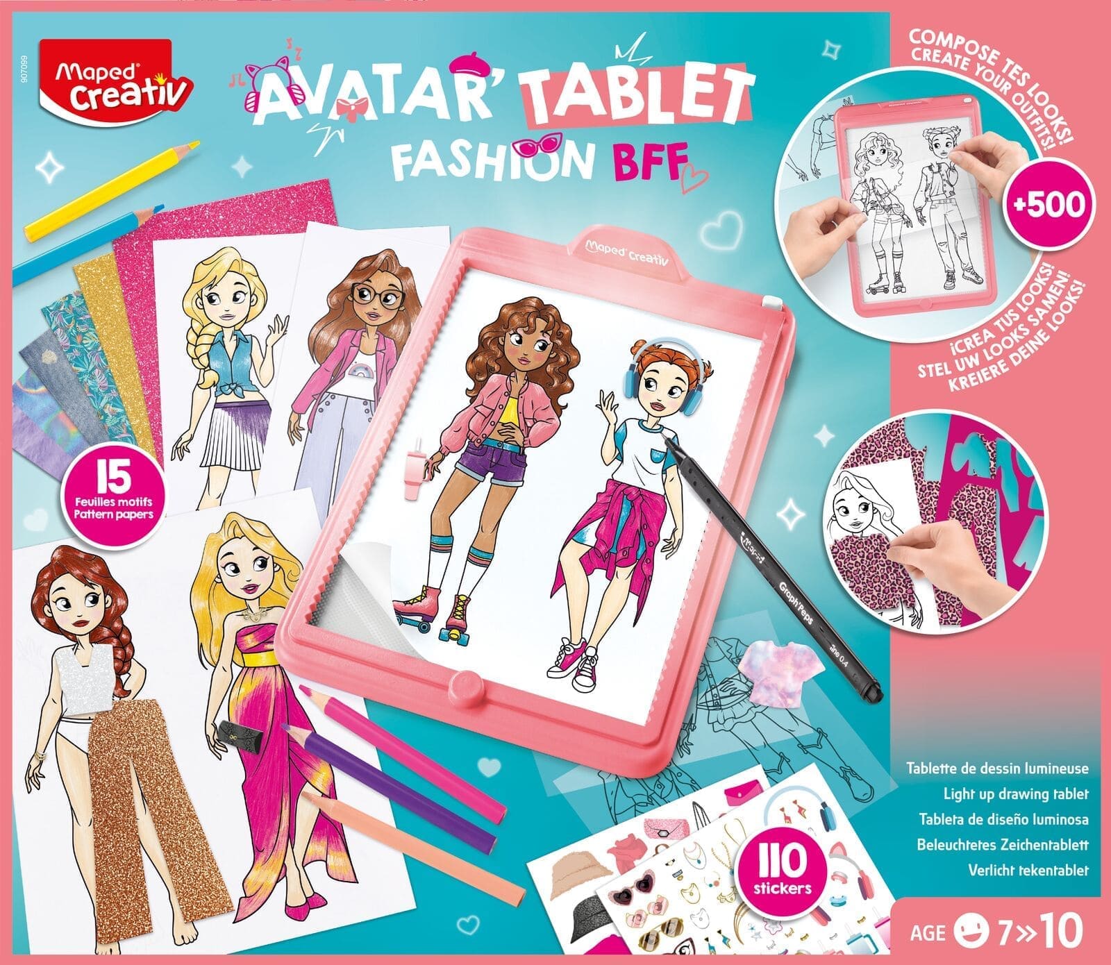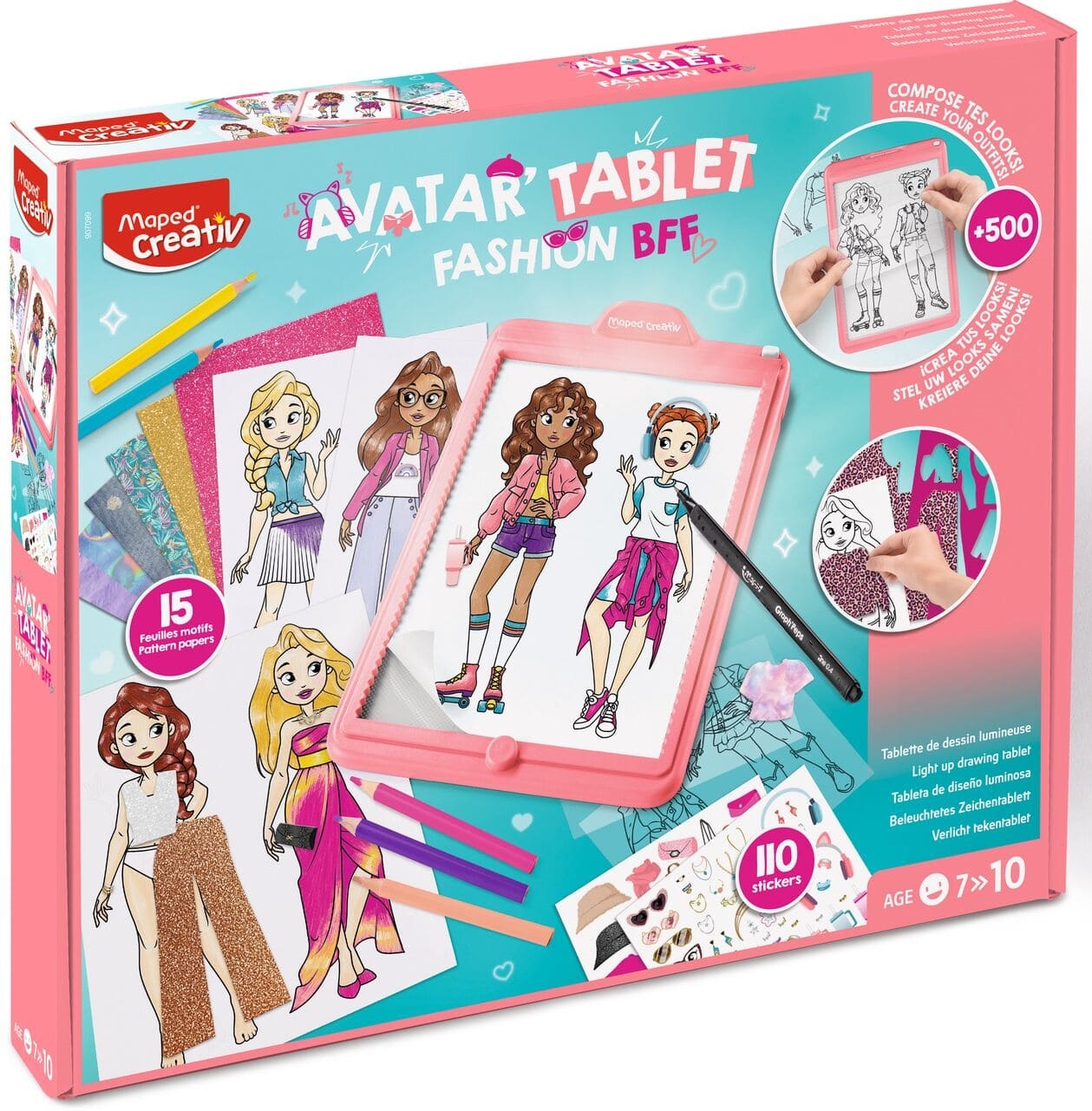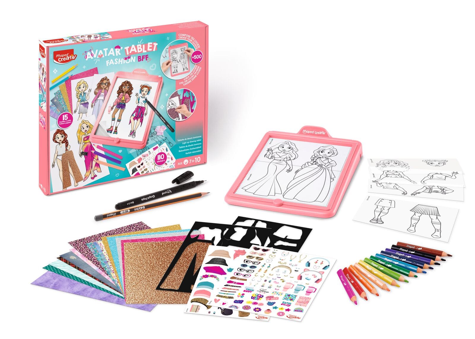 Le coffret inclut la machine à dessiner Avatar’Tablet Fashion pour composer ses silhouettes puis les dessiner, et tout un ensemble de matériel pour les personnaliser : des feuilles et papier aux motifs colorés, des autocollants et des pochoirs pour enrichir chaque avatar avec une touche personnelle.