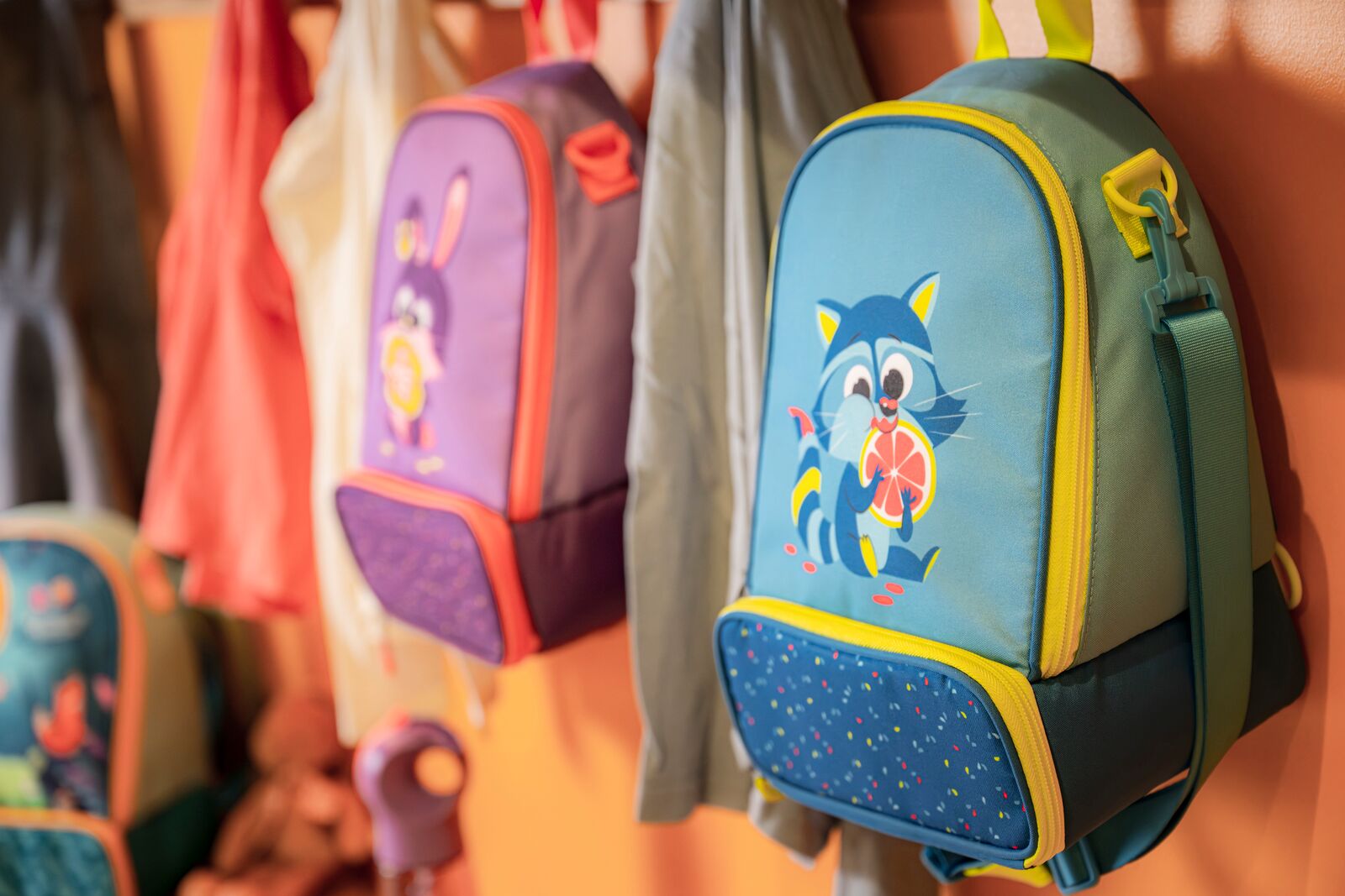 Le sac à déjeuner est disponible en violet et rose avec le lapin et en bleu et vers avec le raton laveur.