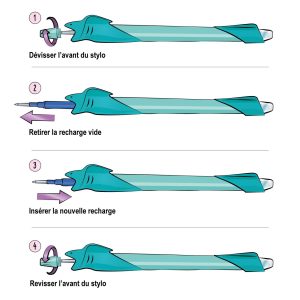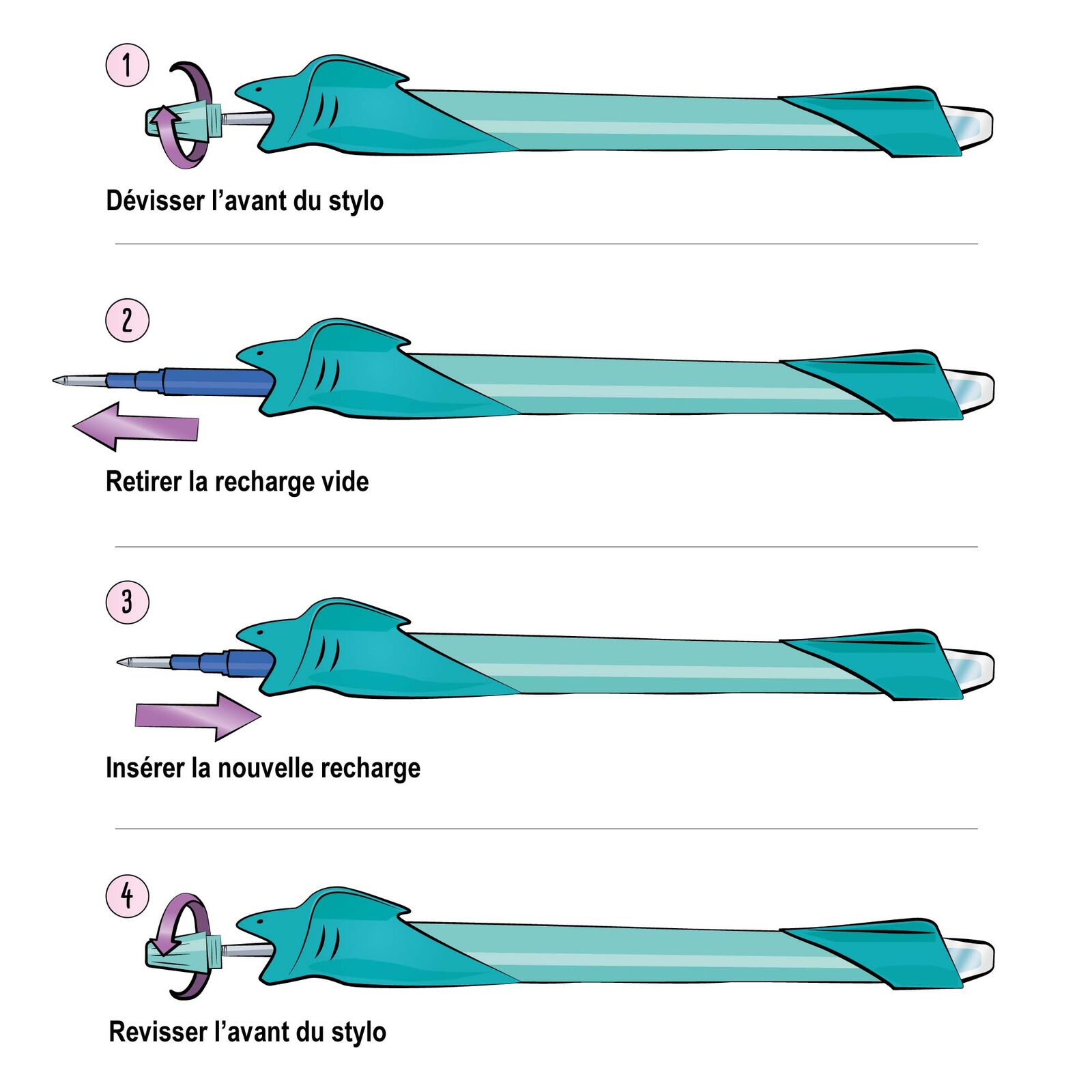 Le stylo effaçable Kidy Learn Magic est rechargeable grâce à un embout dévissable à l’avant du stylo. Il est compatible avec les recharges standards du marché.