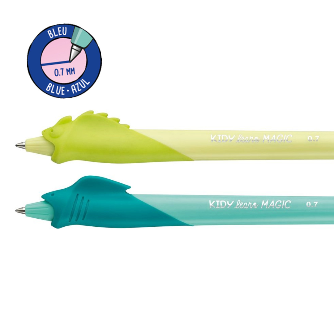 Le kit est composé de 2 stylos effaçables Kidy Learn Magic au design Caméléon et Requin et de 4 recharges d’encre bleue, pointe 0,7mm. Ils stimulent l’envie d’écrire et transforment les premiers exercices en un véritable moment de plaisir.