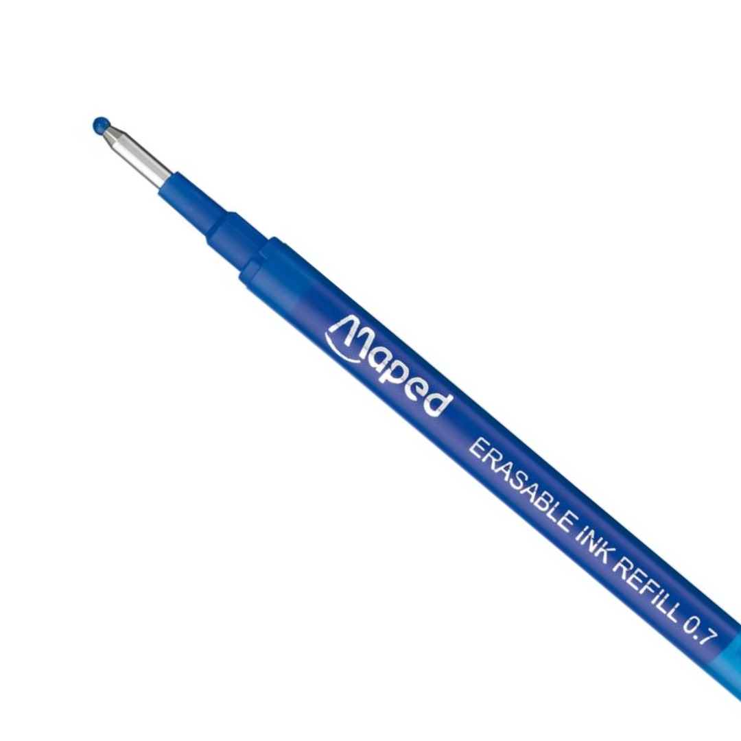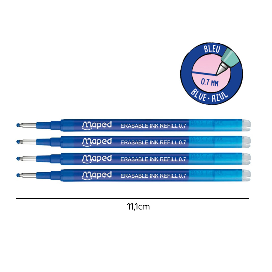 Rechargeable, il est pensé pour durer : 4 cartouches d’encre bleue thermosensible (pointe 0,7mm) sont incluses et assurent une utilisation prolongée à la maison comme en classe. Il est également compatible avec les recharges standards du marché.