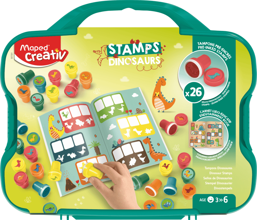 Les enfants découvrent une activité créative ludique sur le thème des dinosaures avec cette mallette de tampons Maped Creativ. Ils décorent et tamponnent leurs dessins, coloriages et créations en tout genre facilement avec ces tampons pré-encrés.