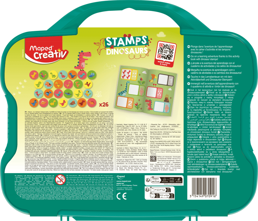 Dès 3 ans, les enfants utilisent leurs tampons dinosaures pour enrichir et décorer leurs créations mais aussi pour compléter le livret d’apprentissage ludo éducatif qui complète le coffret. Différentes activités permettent d’apprendre à reconnaitre les dinosaures, les placer dans leur environnement, etc.